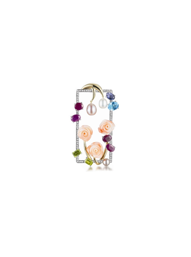 시크릿가든 8은 직사각형 프레임 안에 장미 산호가 풍성하게 피어난 작품으로, 자연의 섬세함과 보석의 화려함이 절묘하게 어우러진 브로치입니다.