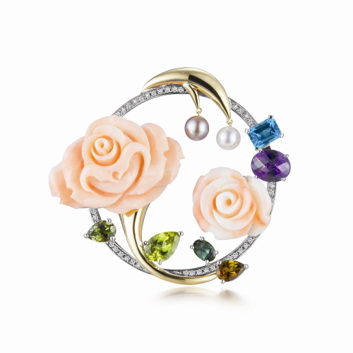시크릿가든 7은 천연 산호로 조각된 장미가 중심을 이루는 브로치로, 순수한 자연의 아름다움을 담아낸 작품입니다. 부드러운 장미빛과 다채로운 보석, 진주가 조화를 이루며 정원의 한가운데 피어난 로맨틱한 순간을 우아하게 표현합니다.