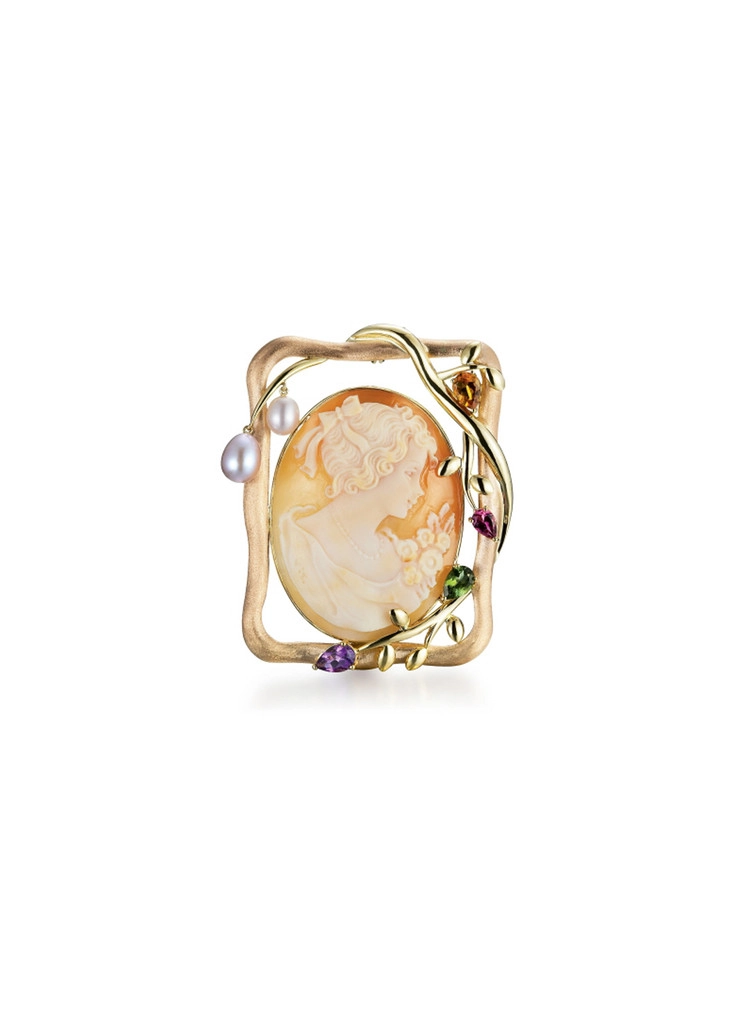 시크릿가든 6은 부드러운 셸 카메오와 곡선의 프레임이 어우러진 낭만적인 브로치겸 펜던트입니다.