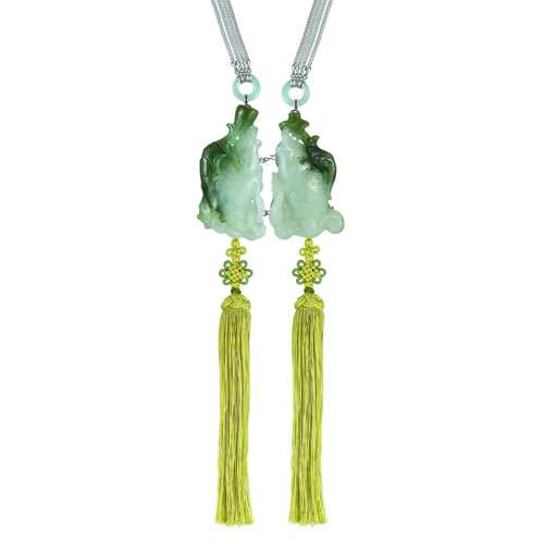 “연(緣)의 매듭 4”와 “5”는 물고기 모양의 라벤더 비취를 각각 조각한 노리개로, 단독으로는 물론 한 쌍으로 결합해 착용할 수 있도록 제작된 작품입니다. 물고기는 풍요와 다산의 상징으로, 좋은 인연이 짝을 이루어 복이 두 배가 되길 바라는 마음을 담고 있습니다.