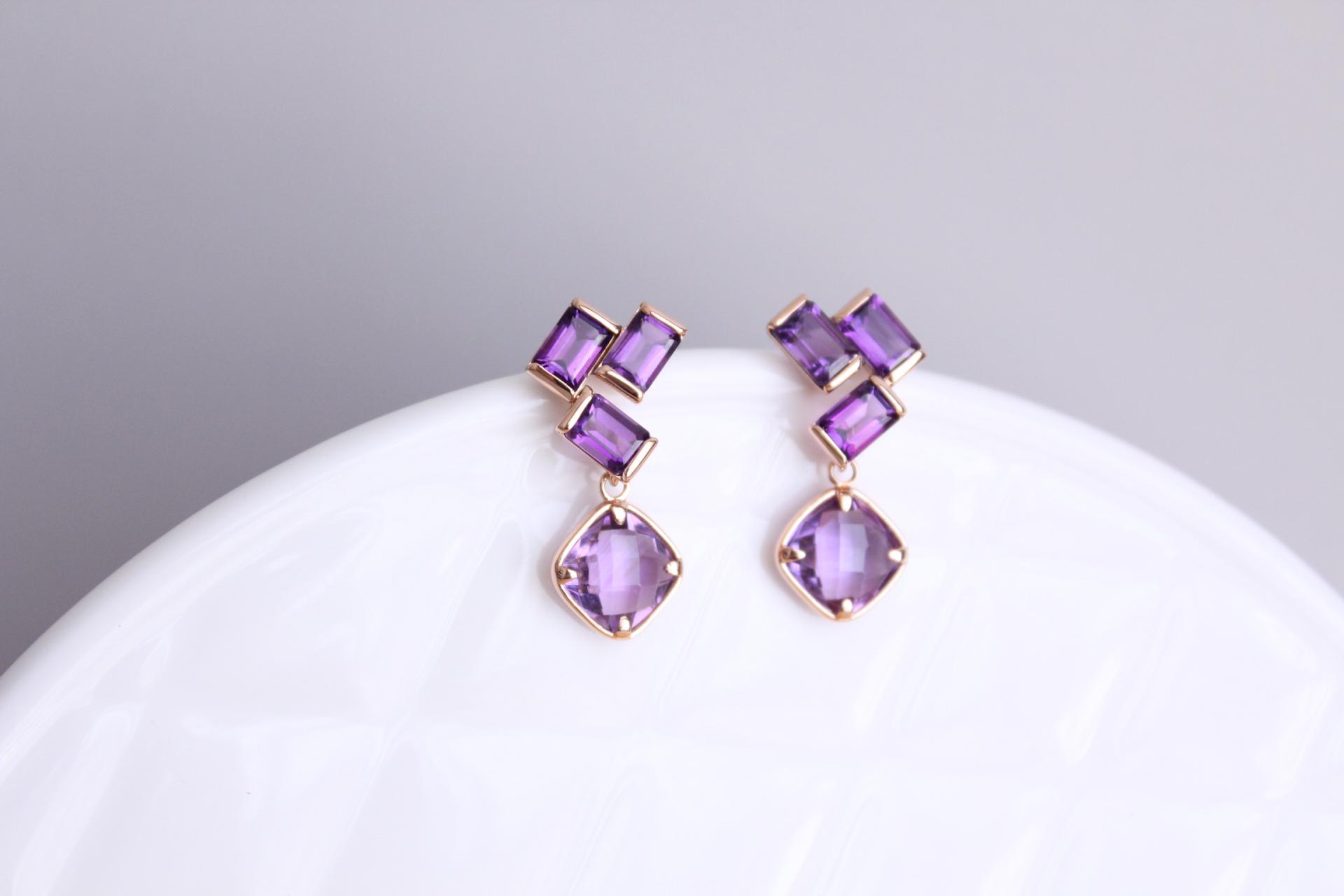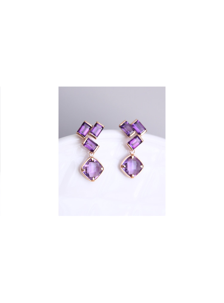 규칙적으로 세팅된 에메랄드컷 자수정이 구조적인 아름다움을 주고, 아래로 떨어지는 쿠션컷 자수정이 움직임 속에서 은은히 빛납니다.