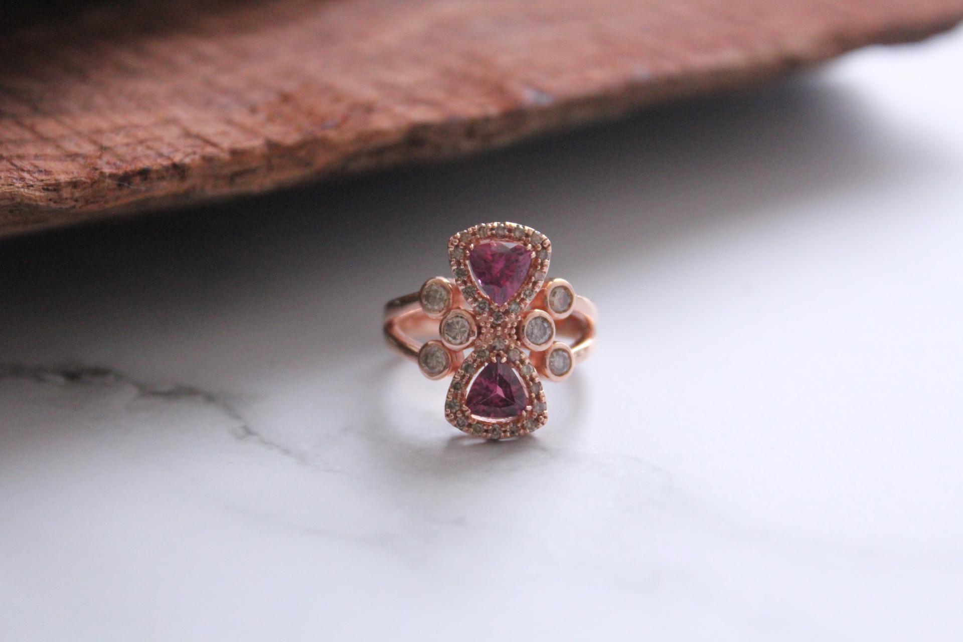 서로를 향해 마주 선 두 개의 로돌라이트 가넷은, 저녁 하늘 위에 겹쳐지는 일식의 순간처럼 조화롭고 신비롭습니다.