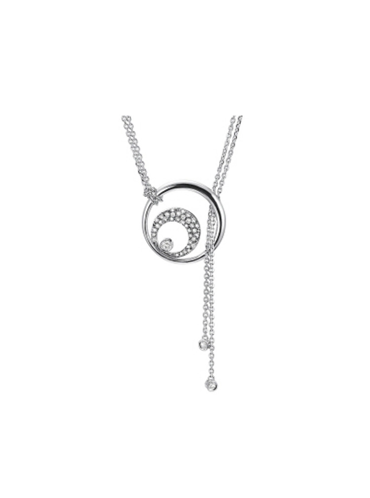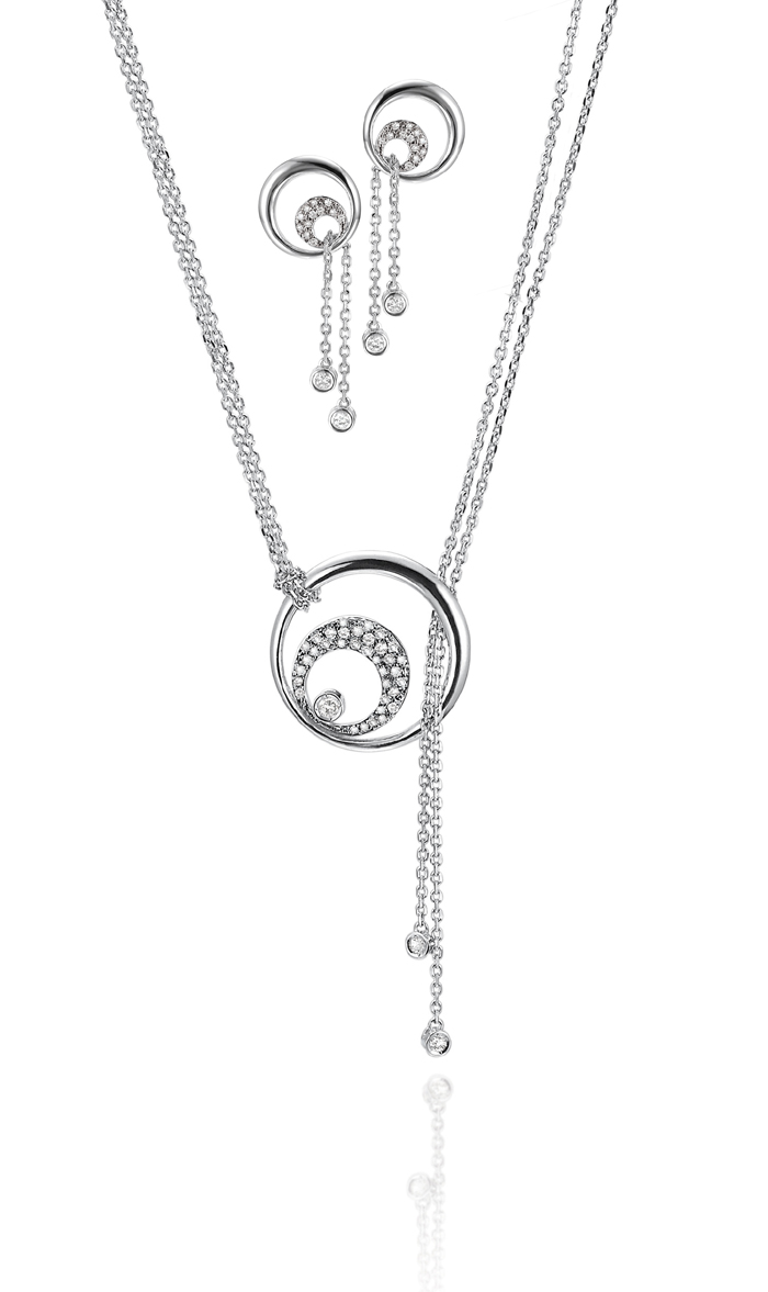 은은한 광채를 품은 원형 프레임 안에 세팅된 다이아몬드가 마치 달의 얼굴처럼 반짝이며, 드리워지는 체인과 원형 모티브는 빛과 그림자의 흐름을 표현합니다.